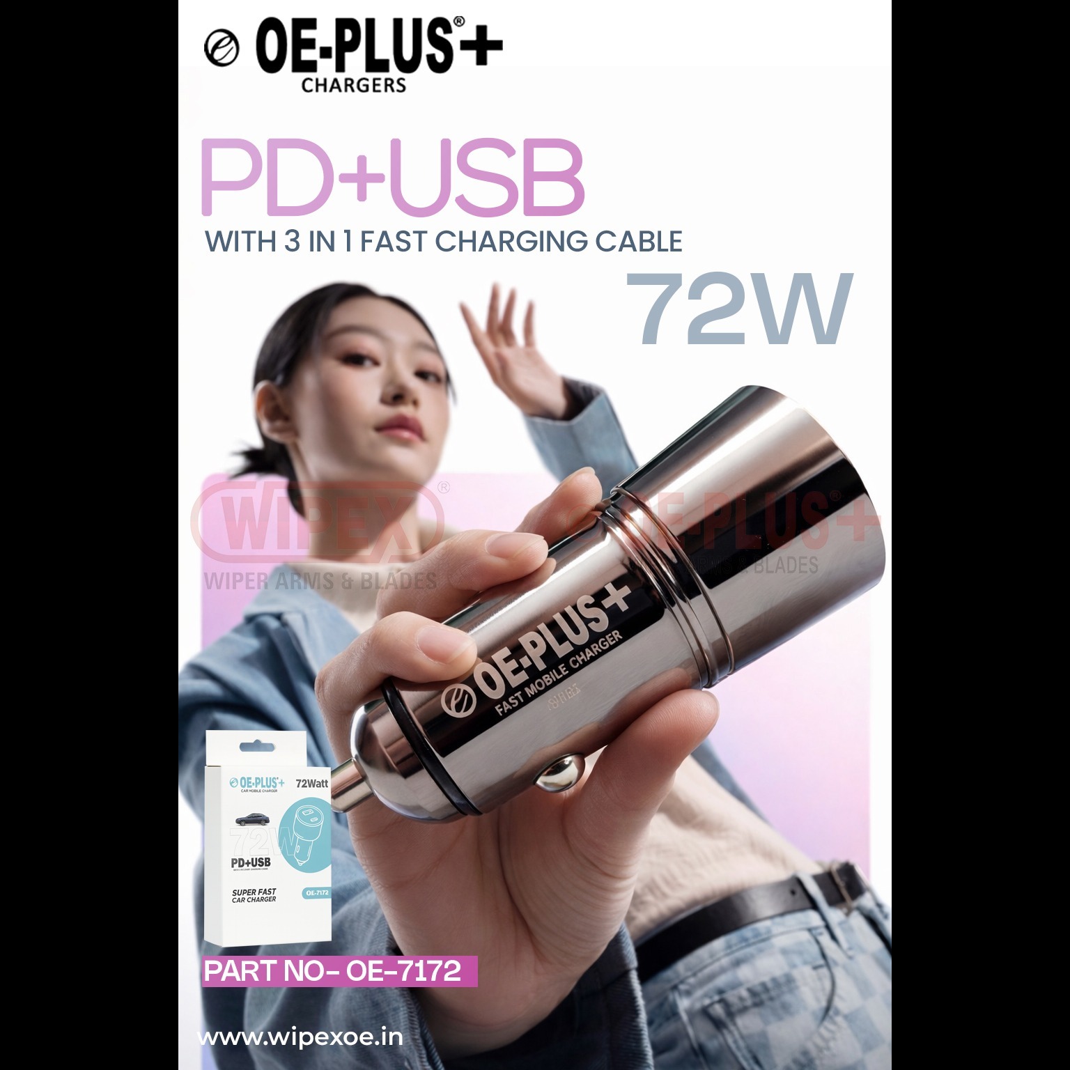 72W car charger, PD fast car charger, USB car charger 72W, super fast car charger, dual port car charger PD USB, OE-PLUS car charger, OE-7172 car charger, fast mobile car charger, USB C PD car charger, multi device car charger, premium metal car charger, car fast charging adapter, smartphone fast charger for car, universal car charger adapter