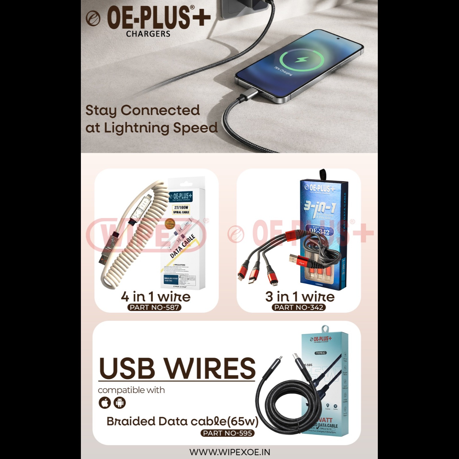 car charging cable, fast charging USB cable, 3 in 1 charging cable, 4 in 1 data cable, braided fast charging cable, 65W fast charging cable, multi device charging cable, USB data cable for car, mobile fast charging wire, type c fast charging cable, durable braided cable, fast sync data cable, car accessories India, OE PLUS charger cable, WIPEX charger cable